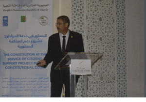 The University of El Oued took part in a seminar today focusing on “Enhancing the Role of Civil Society in Activating Unconstitutionality Appeals”. The opening ceremony was led by Mr. Amar Boudiaf, a member of the Constitutional Court standing in for the President, accompanied by Mr. Said Akrour, Governor of the Wilaya. The event was organized by the Constitutional Court and attended by various dignitaries including members from different branches such as representatives from judicial authority, university leadership, and local government officials; also present were members and staff of the Constitutional Court; Representatives from civil society organizations at both national level and district levels; Members of Parliament; Representatives from international agencies like United Nations Development Program as well as legal professionals and professors.