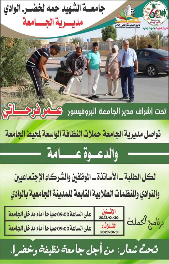 The cleaning campaigns for the surroundings of the University of Martyr Hamou Lkhder will continue on January 30-31, 2023.