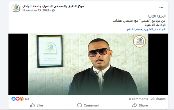 The University of El Oued, in tandem with its efforts to accommodate marginalized groups, initiated a continuous audiovisual program in 2024 through its printing and audio-visual center. Titled “My Willpower,” The program, titled “My Willpower,” aims to integrate individuals with disabilities into various projects, including economic, social, and sports initiatives. It also celebrates the activities and achievements of the students and educators with disabilities while promoting awareness and understanding of disability issues. This program, featuring students and educators with disabilities as presenters and guests, is disseminated through social media platforms including Facebook and YouTube.