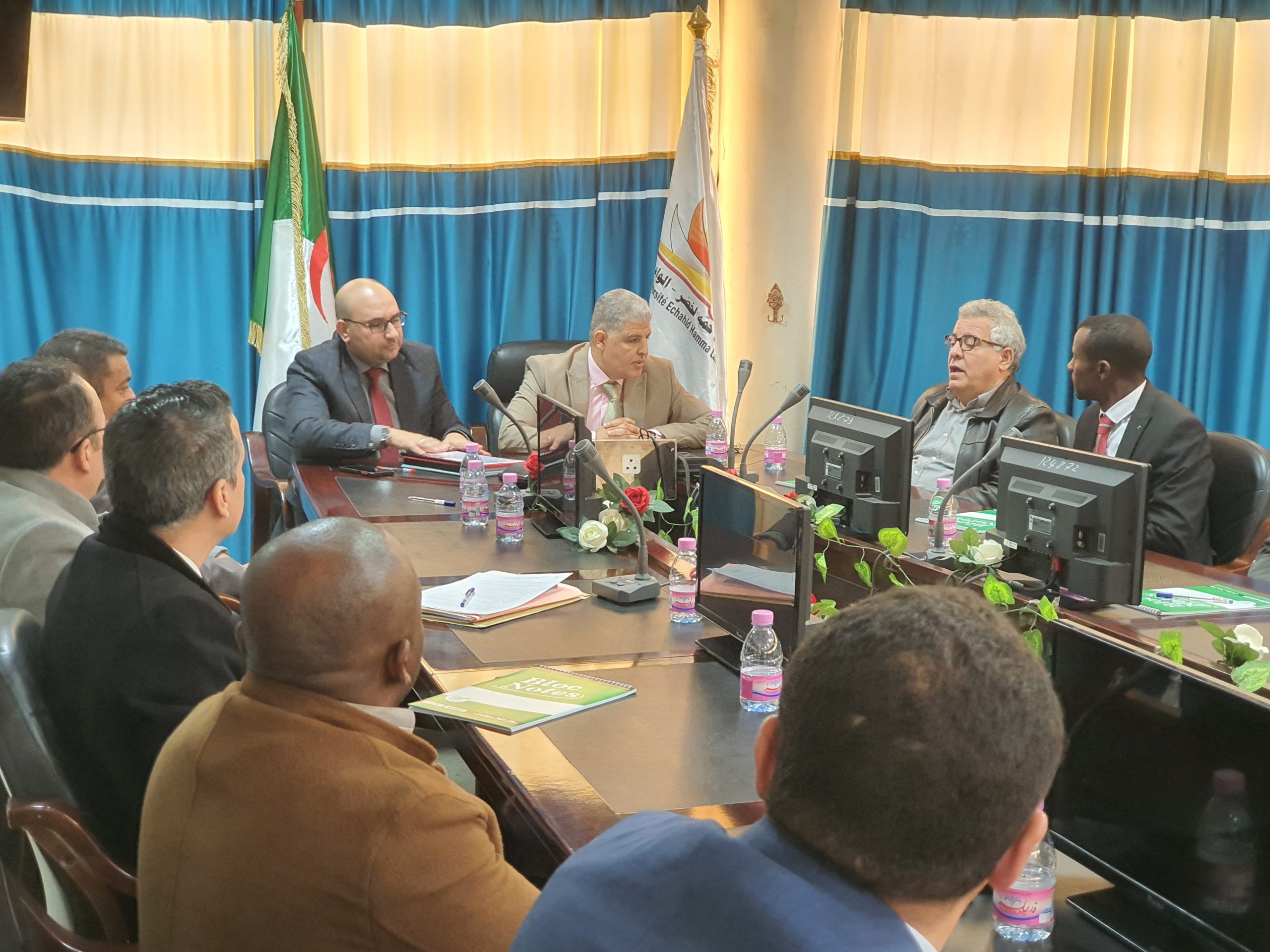 Professor Omar Ferhati, the Rector of the University of El Oued, welcomed the Director of Assets, Resources, and Contracts at the supervisory ministry, along with his counterpart, the Director of Planning and Foresight, Belarbi Yassin, and representatives of the present universities’ delegations. He also welcomed the Director of the Higher School of Agriculture, the Vice-Rector of the University for Research, Scientific and Pedagogical Affairs, the General Secretary of the University, the Director of the Entrepreneurship House, the Director of the Business Incubator, and the Chairman of the Five-Star Student Certificate Committee.