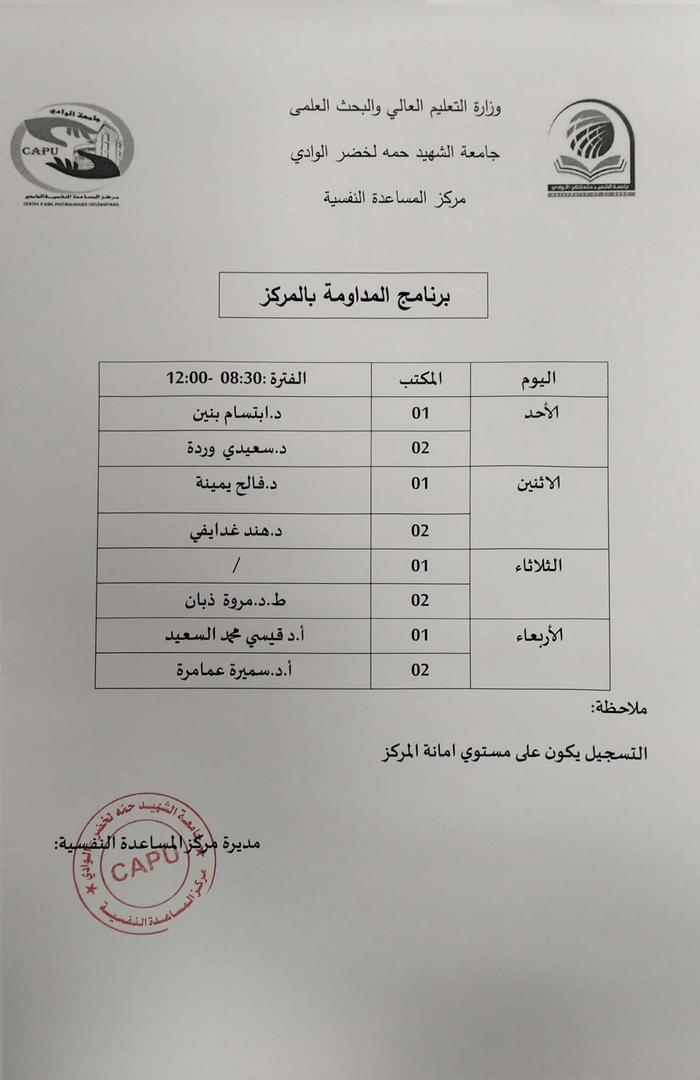 The Psychological Assistance Centre at the University of El Oued reaffirms its dedication to supporting the mental health and well-being of its university community. To enhance accessibility and provide structured support, the centre has published a timetable detailing the availability of its qualified team of psychologists and mental health specialists.