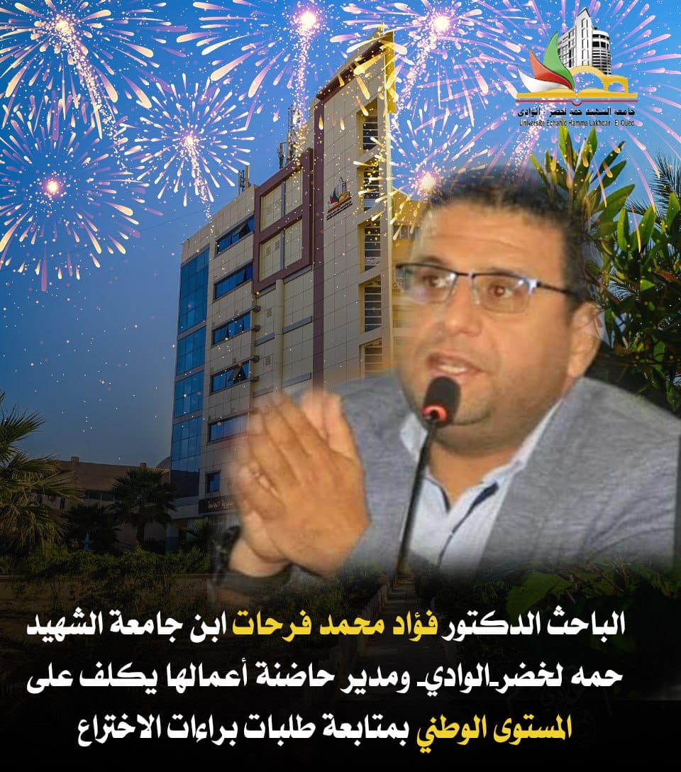 Today, on March 2, 2023, Dr. Mohammed Fouad Farhat has been recruited as the Director of the Business Incubator Center and Technology Support and Innovation Center at the University of El Oued, and he has been designated as a member of the National Coordination Committee for Monitoring Innovation and Entrepreneurship in Universities. He is tasked with overseeing national patent applications, in accordance with Ministerial Decree No. 36 dated March 1, 2023, which established the National Committee for Monitoring Innovation and Entrepreneurship in Universities.