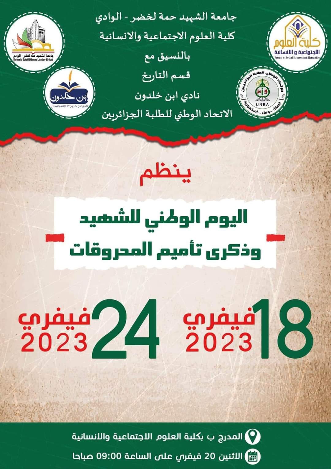 The University of El Oued will organize tomorrow, Monday, February 20, 2023, in the Faculty of Social and Human Sciences in coordination with the History Department, Ibn Khaldoun Club, and the National Union of Algerian Students, a historical and celebratory symposium on the occasion of National Martyrs’ Day and the anniversary of the nationalization of hydrocarbons. The event will begin at 9:00 AM in Auditorium B at the Faculty of Social and Human Sciences.