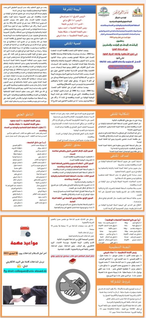 The University of El Oued and the High Authority for Transparency, Prevention and Fight against Corruption Organize a National Forum on February 20-21