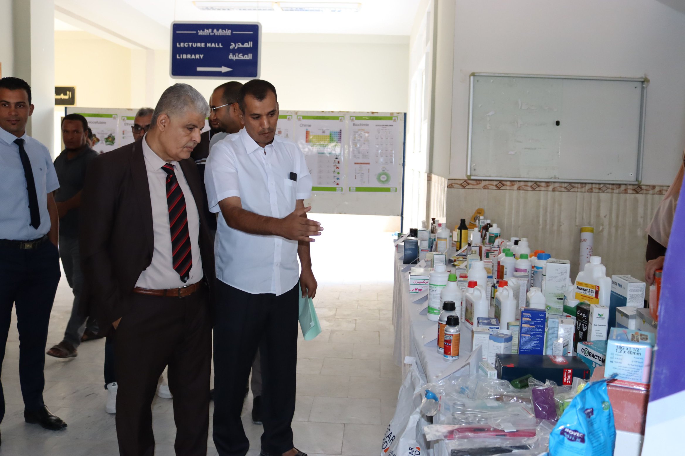 Afterwards, the University Rector toured the exhibition organized on the occasion, where the Head of the Department gave him explanations on the work accomplished, which was in the form of informative posters aimed at the students of the specialization on the teaching method, the courses taught and the professional prospects of the specialization, etc. The University Rector also looked at the explanatory posters prepared for each of the courses that the students will study. He also visited a wing where some of the medicines and equipment used in the veterinary field were displayed. The Rector concluded his visit by thanking the Dean of the Faculty and the Head of the Department for their keenness and efforts.